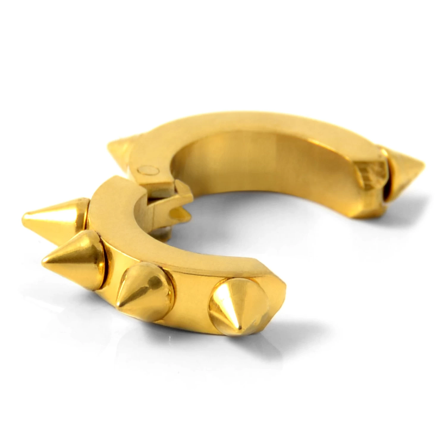 Bright gold-toned steel and a striking spiked design give this circular men’s earring its bold look. Features an easy-to-use hinge mechanism.