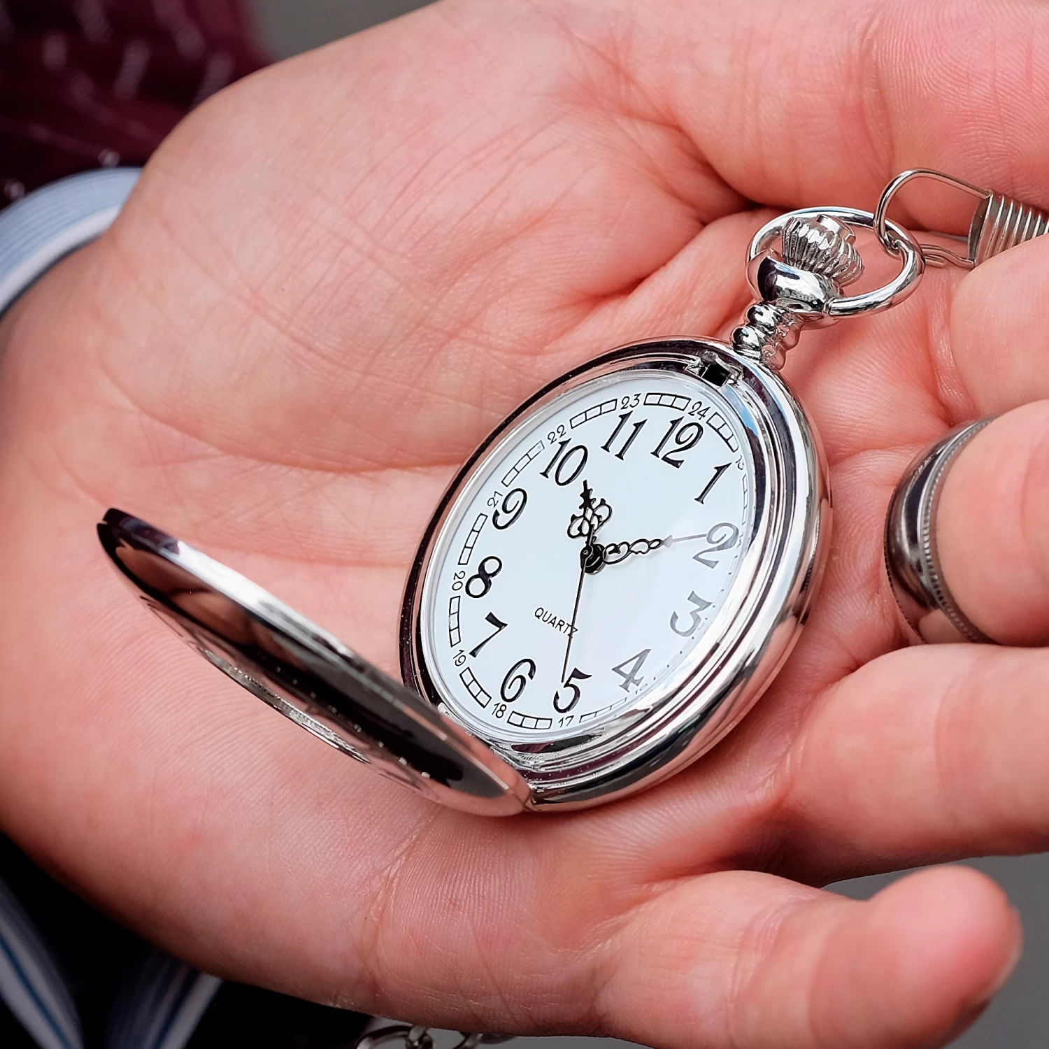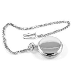 This modern version of a classic timepiece features a silver-tone case and chain, as well as a white face. Front opens and closes by pressing it gently.
