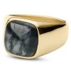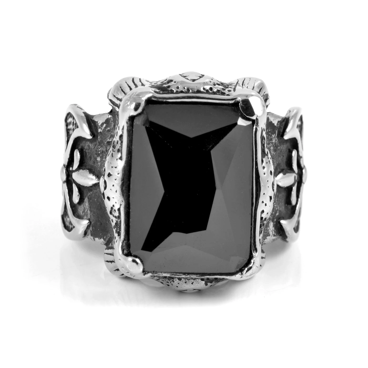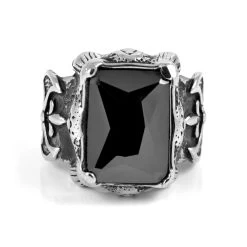 Inspired by French design, this big ring for men features gorgeous fleur de lis engravings on either side. A beautiful black cubic zirconia stone is inlaid into the face for one truly stunning look.