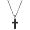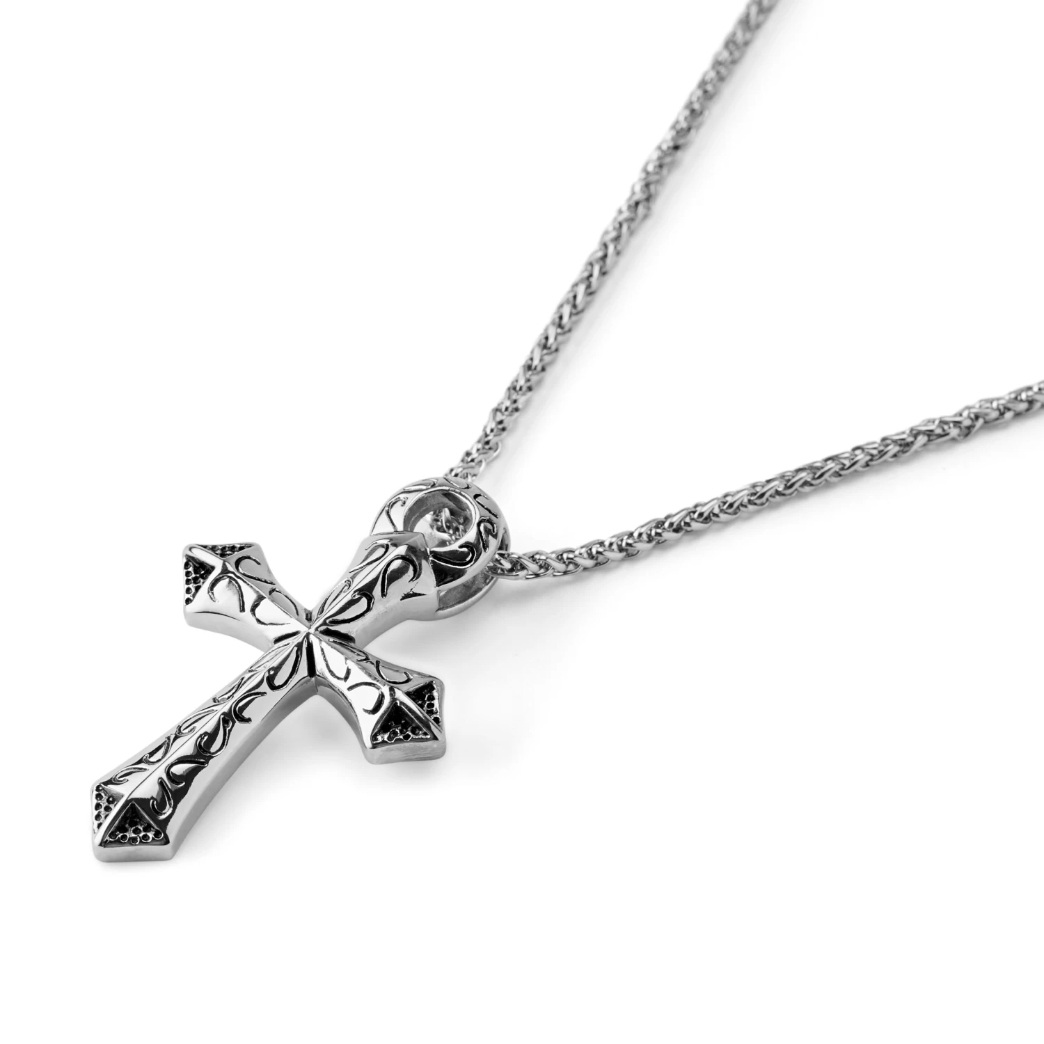Decorated with scrollwork, the oversize, stainless steel pendant for men hangs from a sturdy chain and secures with a lobster clasp.