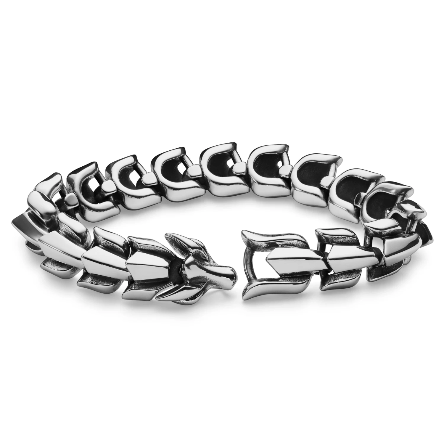 A seamless dragon around your wrist polished to a captivating shine. The clean design of this men’s bracelet is continued on with the discrete clasp – press down on the dragon head and easily fit it onto the other end.