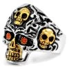 A gorgeous black stone is held in place by two skulls, two crosses, and four raven heads. Finished with a sleek silver tone and elegant black detailing.