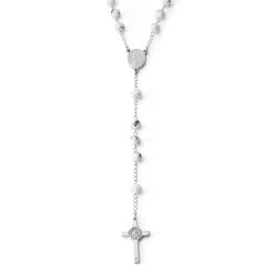 This beautiful rosary necklace features white and black speckled acrylic beads and silver-tone metal. Finished with a cross and ‘Our Lady of Guadalupe’ medal.