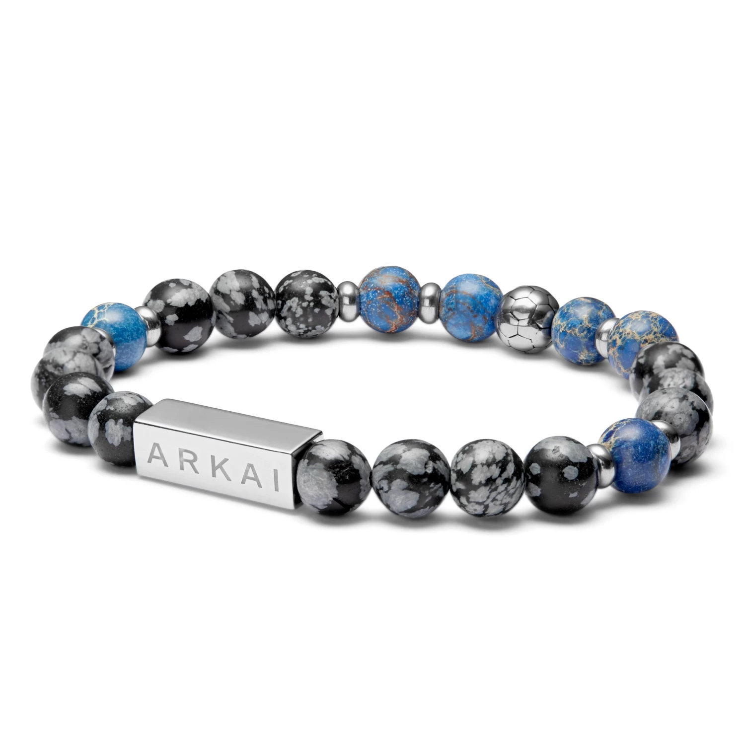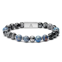 Originally used as a weapon, Snowflake Obsidian stone has volcanic origins and a history spanning the Stone Age. This bracelet blends this beautiful stone with blue Imperial Jasper and silver-tone steel accents.