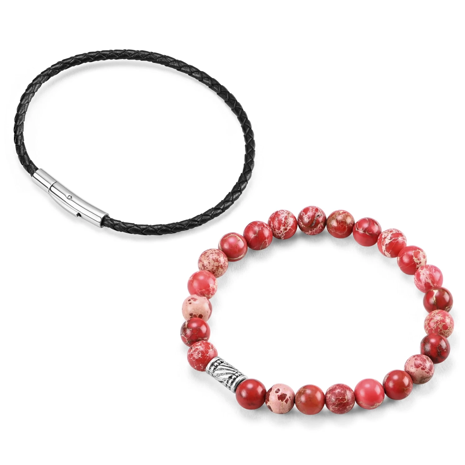 Braided glossy black leather contrasts elegantly with vibrant red agate stones in this 2 bracelet set.