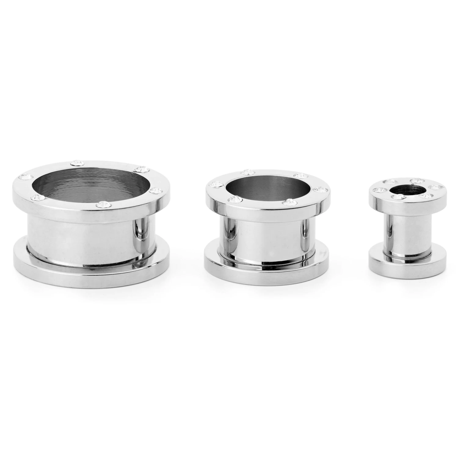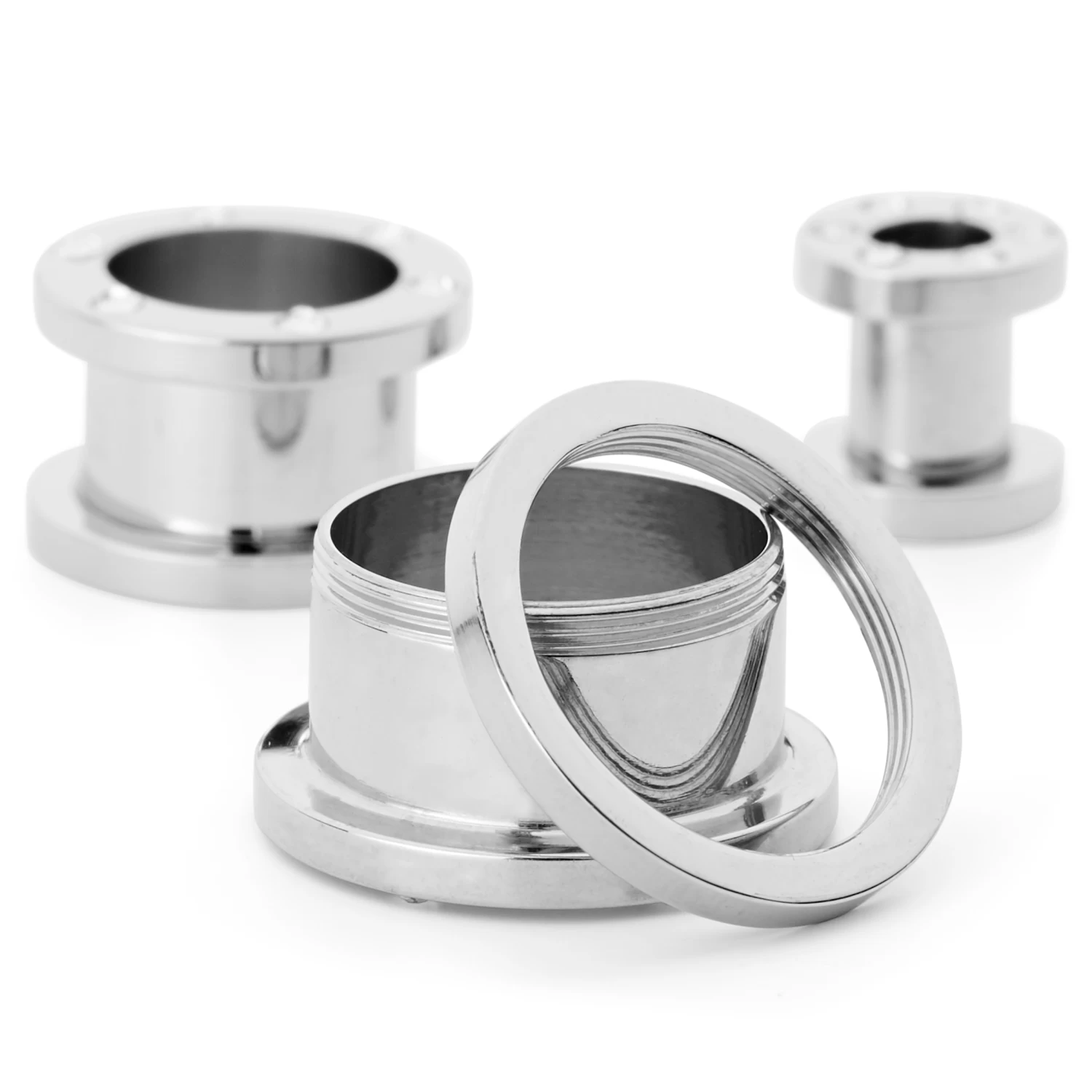 Created with polished surgical steel and features a screw-fit with a removable back. Unscrew the back for quick insertion. Resembles a double flare once in place.