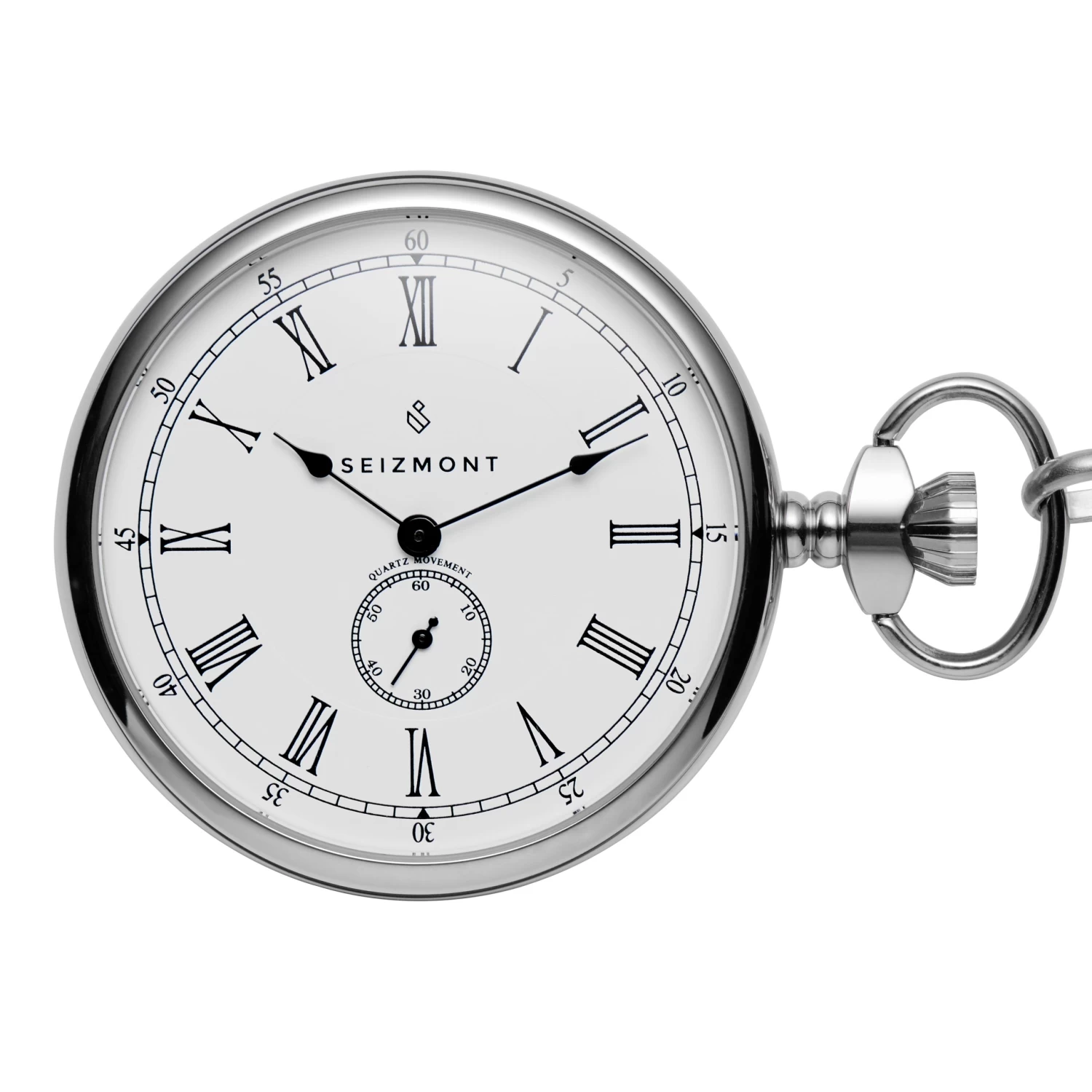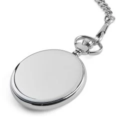 This elegant selection for men features a surgical steel case that withstands the test of time. The white face features classic Roman numerals and a subdial that counts the seconds. Includes a chain that securely clips to your pocket or belt. Japanese Miyota movement.