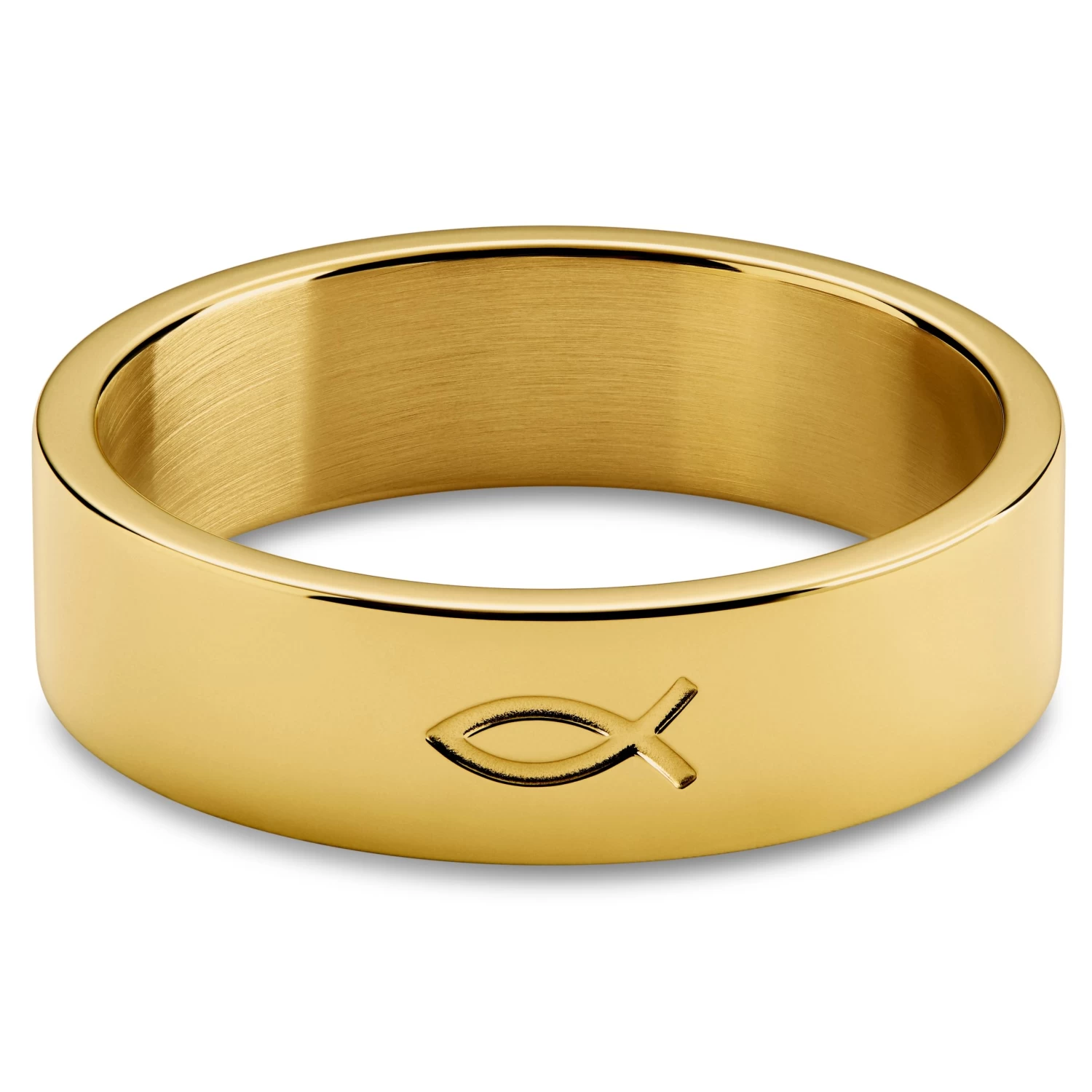 The Ichthus is engraved on the surgical steel surface of this men’s ring. Polished for sleekness with a handsome gold tone accomplished with PVD coating. Titanium nitride is fused to the surface on a molecular level – the scratch-resistant finish won’t fade or flake over time.