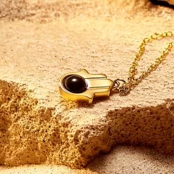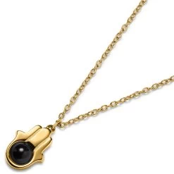 This men’s necklace features this ancient sign on a pendant dangling from its tough cable link chain. At the center of the pendant lies a natural onyx bead. Onyx is associated with wisdom, inner strength, and protection – the perfect stone to pair with the Hamsa hand.