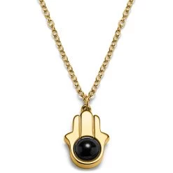 This men’s necklace features this ancient sign on a pendant dangling from its tough cable link chain. At the center of the pendant lies a natural onyx bead. Onyx is associated with wisdom, inner strength, and protection – the perfect stone to pair with the Hamsa hand.