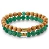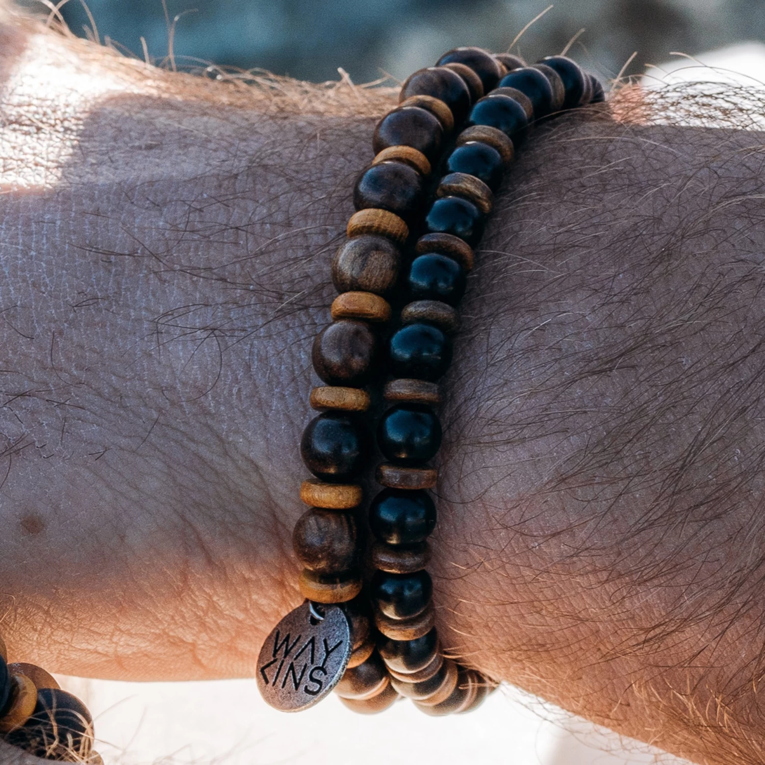 One bracelet features natural-colored beads with a metal Waykins tag, while the other boasts smaller dark beads. The set can be worn together or separately and comes with a gift pouch.