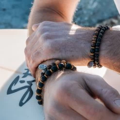 Inspired by the surf, these two bracelets are easy to wear and strung on sturdy elastic cords.
