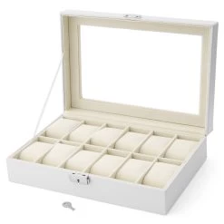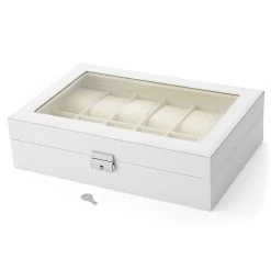 This elegant white watch case holds 12 of your finest timepieces, with a large glass lid for easy admiration.