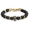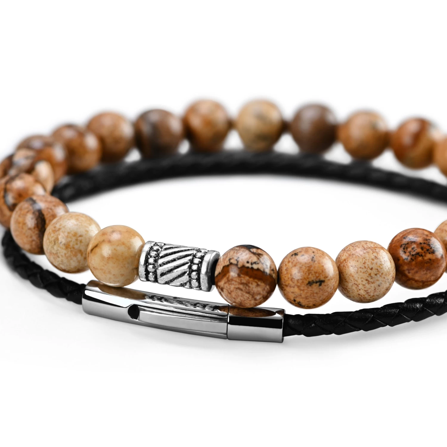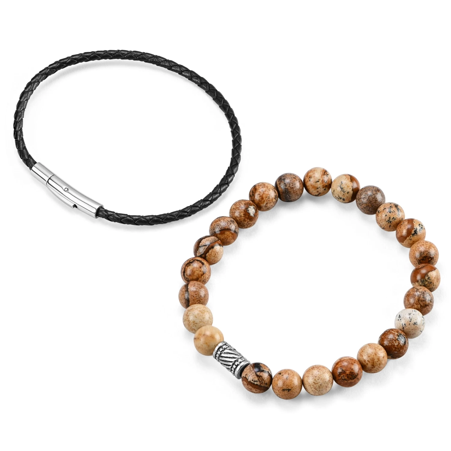 The simple black leather braid attaches securely with a polished silver-toned mag-lock clasp. The second bracelet features beautifully marbled stone beads on a strong silicone rubber band that simply slips on your wrist. Features a brushed prayer-wheel pendant. Comes in a beautiful Neshraw gift bag.